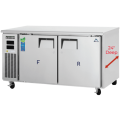 Undercounter/Worktop Dual Temperature Refrigerator/Freezer Combo, two-section, 59-1/2"W, 24" Depth, 6.0 (R) & 6.0 (F) cu. ft. capacity, self-contained side mounted refrigeration, 16 gauge stainless steel worktop, (2) solid hinged self-closing doors (locking), (4) epoxy coated wire shelves, height adjustable clips, digital controls with LED display, auto defrost (freezer), LED interior lighting, pressure relief port, stainless steel interior, stainless steel front & sides, galvanized steel bottom & rear, (4) 5" swivel casters (2 locking), 1/2 HP, 115v/60/1-ph, 5.2 amps, cord, NEMA 5-15P, NSF, cETLus, ETL-Sanitation