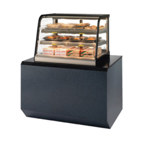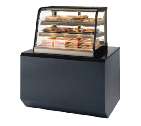 Counter Top Hot Self-Serve Merchandiser, 24"W x 29.7"D x 25.1”H, curved glass styling, (3) hinged lift-up front door, top light & lighted shelves, (2) tiers of adjustable stainless steel heated shelves, stainless steel display deck, stainless steel construction with black trim, removable sliding glass rear doors, tempered glass end panels, set directly on counter, cord & plug, cULus, UL EPH Classified, Made In USA