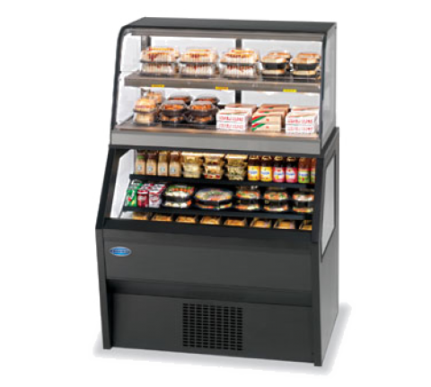 Specialty Display Hybrid Merchandiser Refrigerated Self-Serve Bottom With Heated Self-Serve Top, 48"W x 39"D x 69.75”H, refrigerated self-serve bottom: black laminated exterior with black trim, horizontal top & front light, (2) tiers of black metal shelves with black interior, tempered glass ends, Hot Self-Serve Top: (3) hinged lift-up doors, black trim, top light with lighted shelves, adjustable stainless steel heated shelves, sliding rear doors, 1/2 HP, cULus, UL EPH Classified, Made In USA, DOE 2017 compliant
