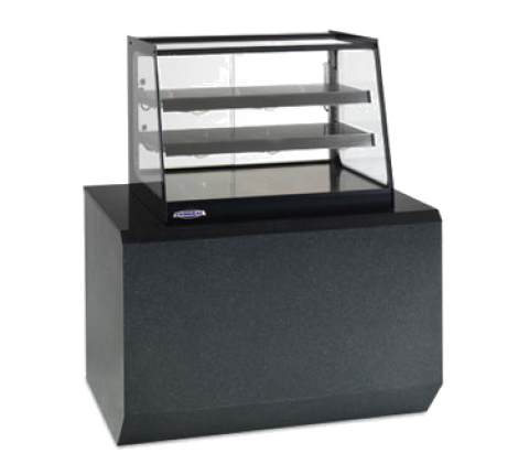 Elements Countertop Heated Merchandiser, 47"W x 29.7"D x 25.1”H, tempered front glass, incandescent top light & lighted shelves, (2) tiers of adjustable stainless steel heated shelves, stainless steel display deck, black trim, removable sliding glass rear doors, tempered glass end panels, set directly on counter, cord & plug, 120v/60/1-ph electrical, cULus, UL EPH Classified, Made In USA, DOE 2017 Compliant
