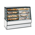 High Volume Vertical Dual Zone Bakery Case Refrigerated Left Non-Refrigerated Right, 59-1/8"W x 35-5/16"D x 42”H, self-contained refrigeration with condensate evaporator, adjustable temperature control, sloped Thermopane tilt-front glass, LED top light &lighted shelves, (2) tiers of adjustable white wire shelves, glass sliding rear doors, white interior, tempered glass ends, choice of laminate with black trim, designed for continuous lineups, 1/3 HP, cULus, UL EPH Classified, Made In USA, DOE 2017 compliant