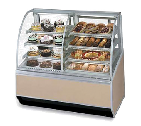Series ’90 Dual Bakery Case Refrigerated Left Non-Refrigerated Right, 48-1/4"W x 37-3/4"D x 48-1/2”H, self contained refrigeration with condensate evaporator, adjustable temperature control, tempered curved lift-up front glass, top light & shelf lights, (3) tiers of adjustable white wire shelves, white interior, removable glass sliding rear doors sloped for easy product access, tempered glass ends, choice of laminate & trim, 1/3 HP, cULus, UL EPH Classified, Made In USA, DOE 2017 compliant