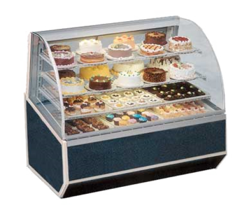 Series ’90 Refrigerated Bakery Case, 59-1/4"W x 37-3/4"D x 48-1/2”H, self contained refrigeration with condensate evaporator, adjustable temperature control, tempered curved lift-up front glass, top light & shelf lights, (3) tiers of adjustable white wire shelves, white interior, removable glass sliding rear doors sloped for easy product access, tempered glass ends, choice of laminate & trim, cULus, UL EPH Classified, Made In USA, DOE 2017 compliant