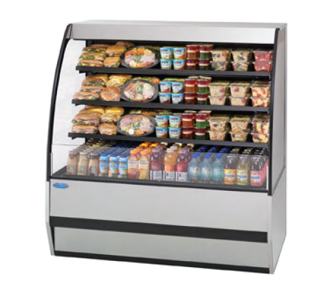 Specialty Display Prepared Foods Merchandiser, 36.2"W x 34.3"D x 52.3”H, self-contained refrigeration with PTC condensate evaporator, adjustable temperature control, 3500K LED horizontal top & shelf lights, (3) tiers adjustable solid black metal shelves, black display deck & black interior, black trim, tempered glass ends, choice of laminate, designed for continuous lineups, 1/3 HP, cULus, UL EPH Classified, Made In USA, DOE 2017 compliant