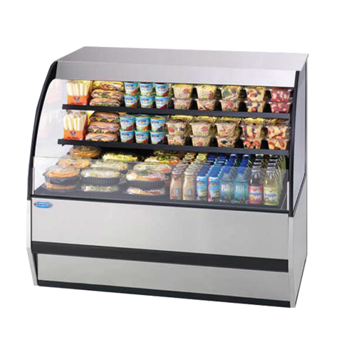 Specialty Display Versatile Service Top over Refrigerated Self-Serve Deli Merchandiser, 50.2”W x 34.3”D x 42.6”H, self-contained refrigeration with PTC condensate evaporator, adjustable temperature control, 3500K LED horizontal top light, stainless steel top, (2) adjustable metal shelves with lights, black interior, black trim, tempered glass ends, rear mounted appliance receptacle (separate 120V 15A circuit required), choice of laminate, 1/2 HP, cULus, UL EPH Classified, Made In USA, DOE 2017 compliant