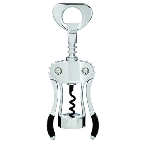 Primo Wing Corkscrew, 5-5/8" overall length, black open spiral, with bottle cap opener, rubber base on handles, chrome plated, silver, Made in Italy (factory box)