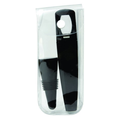 Traveler's™ Wine Kit, includes: (1) corkscrew- 5" overall length, spiral, bottle cap opener, protective sheath comes off to form cross bar, ABS plastic (3010), (1) bottle stopper (8165), (1) storage bag (bulk pack)