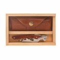 Castello™ Waiter's Corkscrew Set, two-step, includes: (1) corkscrew- 4-3/4" overall length, spiral, serrated blade, cocobolo wood handle, stainless steel (3142), (1) 6-1/2"W x 4-1/4"D x 1-3/4"H wood box with clear acrylic sliding top (10-0200) and (1) 4-7/8"W x 2-1/4"D leather pouch with belt loop, Made in Italy (factory box)