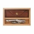 Castello™ Waiter's Corkscrew Set, two-step, includes: (1) corkscrew- 4-3/4" overall length, spiral, serrated blade, aluminum handle, stainless steel (3146), (1) 6-1/2" x 4-1/4" x 1-3/4" wood box with clear acrylic sliding top (10-0200) and (1) 4-7/8"W x 2-1/4"D leather pouch with belt loop, Made in Italy (factory box)