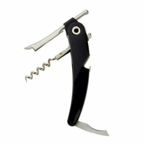 Pull Corkscrew, 5-1/4" overall length, pinion shafted spiral, blade, Italian-designed, gray rubber trim exterior handle, foil cutter, crown cap opener, black (retail box)