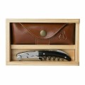 Clos Laguiole Waiter's Corkscrew Set, includes: (1) corkscrew- 5" overall length, elongated conical spiral, serrated blade, finger nail grip, bottle cap opener, (2) adjustable axis connections, black horn handle, (1) two-sided wrench, (1) wooden box, (1) leather pouch with belt loop, Made in France (factory box)