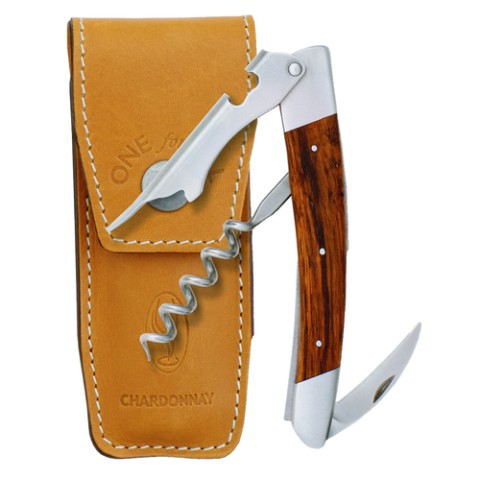 La Vigne Waiter's Corkscrew, 4-7/8" overall length, spiral, micro serrated blade, bottle cap opener, chardonnay wood handle, include: tan holster with belt loop, stainless steel, satin finish, Handmade in France (factory box)