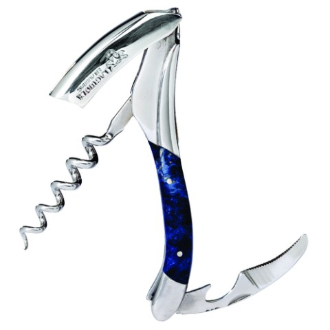 Laguiole en Aubrac™ Waiter's Corkscrew, 4-3/4" overall length, cone-shaped spiral, serrated blade & bottle opener combo, sycamore wood handle, blue, includes: 6"W x 2-1/2"D x 1-1/2"H wood box, with black finish, Made in France (factory box)