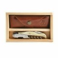 Laguiole Millesime®Waiter's Corkscrew Set, includes: (1) corkscrew- 4-3/4" overall length, spiral, serrated blade, ABS plastic handle, blonde horn (3332), (1) 6-1/2"W x 4-1/4"D x 1-3/4"H wood box with clear acrylic sliding top (10-0200), (1) 4-7/8"W x 2-1/4"D leather pouch with belt loop, Handmade in France (factory box)