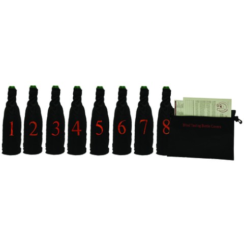 Blind Wine Tasting Kit, includes: (8) 13-1/4"H black polyester wine bottle sacks, with 1-8 numbers printed in red, (8) hook and loop straps, (1) scoring sheet with chart, (1) 9" x 12" polyester storage pouch with zipper (bulk pack)