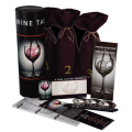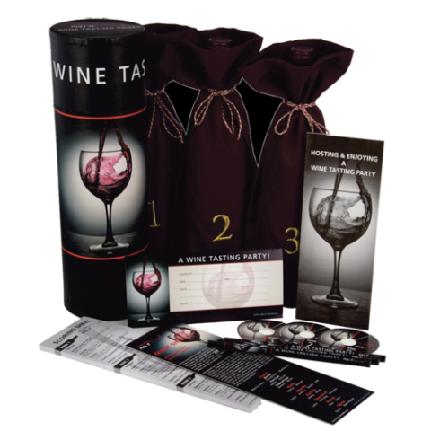 Blind Wine Tasting Party Kit, includes: (3) 13-1/4"H burgundy cotton wine bottle sacks with attached cords, embroidered with numbers 1-3 in gold, (12) pencils, (12) invitations, wine glass identifiers, quick fact sheet and rating pad (retail box)