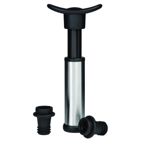 VinoVac™ Vacuum Wine Preservation, includes: (1) 3-1/4" x 1-1/4" x 5" stainless steel pump, (2) black stoppers (premium carded)