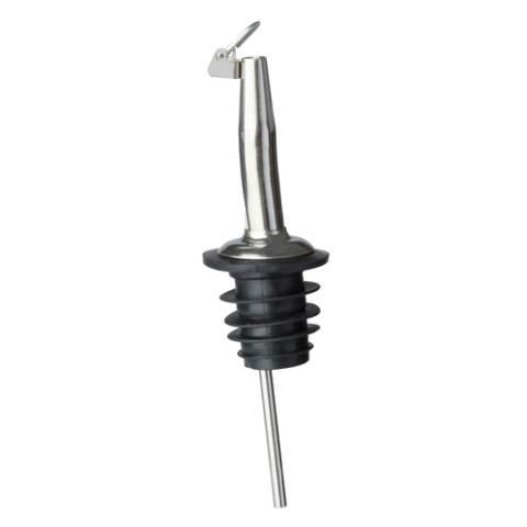 Fast Liquor Bottle Pourer, 4-3/8" long, without collar, self closing lid, long-neck, black plastic cork, stainless steel (bulk pack)