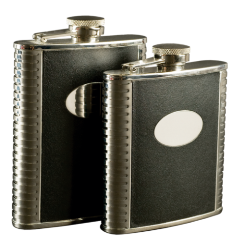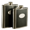 Deluxe Pocket Flask, 8 oz., 3-3/4"W x 1-1/8"D x 5-7/8"H, captive-top, ribbed side grips, bonded black leather front and rear, 18/10 stainless steel body (factory box)