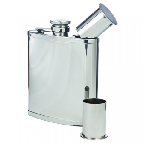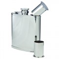 Pocket Flask, 6 oz., 3-3/4"W x 4-3/4"H, captive-top, (2) 0.8 oz. jiggers nest into top, stainless steel (factory box)