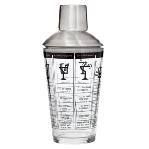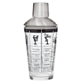 Cocktail Shaker Set, 3-piece, includes: (1) 16 oz., 3-1/2" dia. x 8-1/4"H glass shaker shell, (1) brushed stainless steel strainer, with beaded seal and (1) top cap, with (7) recipes & measurement indications (in oz. and ml) (retail box)