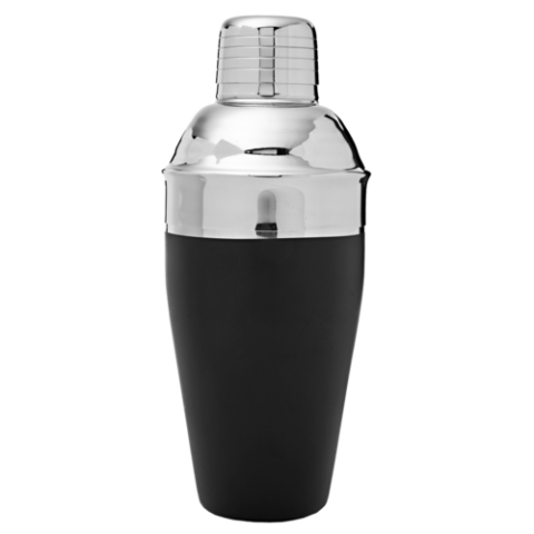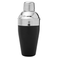Tavern Soft Grip Cocktail Shaker Set, 3-piece, includes: (1) 18 oz., 3-1/2" dia. x 7-7/8"H, round shaker, (1) strainer and (1) jigger cap, stainless steel, slip-free rubberized exterior, black (retail box)