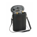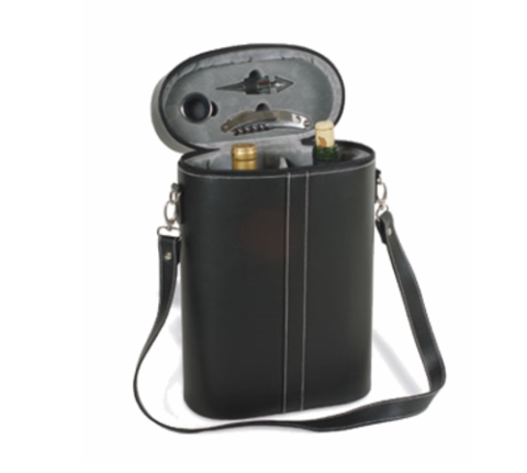 Wine/Champagne Travel Case Set, (2) bottle capacity, 8-1/2"W x 4"D x 14"H, zipper top with handle, shoulder strap, padded partitioned compartment, includes: curved stainless steel corkscrew, cone-top wine stopper & stainless steel drip collar, leatherette, black (factory box)