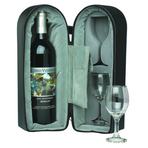 Wine/Champagne Travel Case, (1) bottle capacity, (1) 7-3/8"W x 4-3/8"D x 13-1/2"H, carrying strap, zip closure, padded compartment, sewn-in pouch with hook and loop closure pocket, (4) metal studs at base, leatherette, black, includes: (2) 5 oz. wine glasses (factory box)