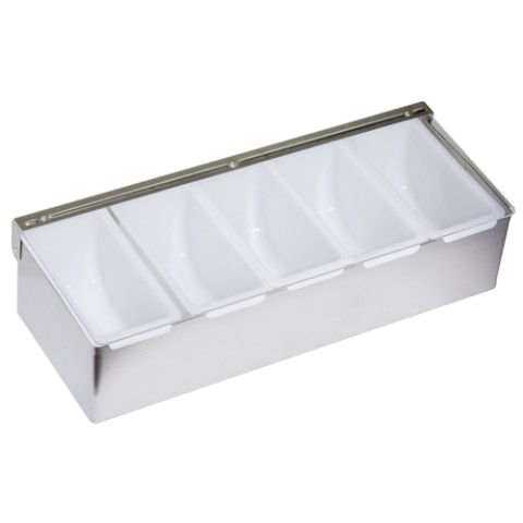 Barkeeper's Condiment holder, 14-3/4" long, (5) 1 pint capacity, 2-3/4"W x 5-3/4"D x 3-7/8"H polypropylene plastic compartments, clear hinged lid, brushed stainless steel frame (factory box)
