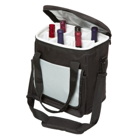 Wine/Champagne Travel Tote, (6) bottle capacity, 11-1/2"W x 7-1/2"D x 13-1/2"H, insulated, carry handle, adjustable shoulder strap, interior padded bottle dividers, light gray front pouch, nylon, black (factory box)