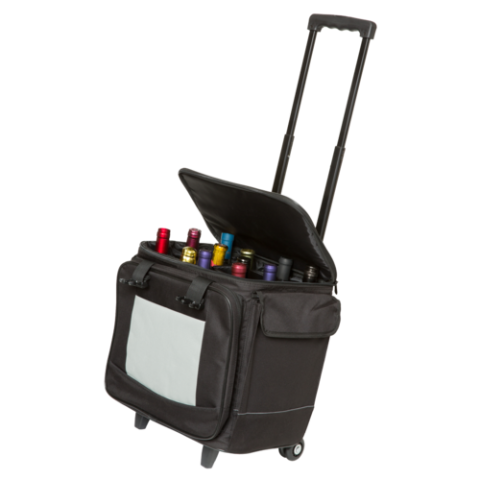 Wine/Champagne Travel Tote, (12) bottle capacity, 14-3/4"W x 11-1/2"D x 16-3/4"H, insulated, carry handle, adjustable shoulder strap, two-way locking zipper, removable 12-bottle separator inset, (2) side pockets, with hook and loop flap closures, (1) light gray front pouch, with added small pouches, double track rear rubber wheels, telescopic aluminum 2-step handle with push button, nylon, black (factory box)