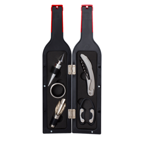 Chateau Swing Out Bottle Gift Set, 6-piece, includes: (1) stainless steel curved corkscrew, (1) foil cutter, (1) chrome bottle stopper, (1) stainless steel drip collar, (1) stainless steel pourer with stopper, (1) bottle shape cabinet with magnetic closure & shiny exterior finish (retail box)