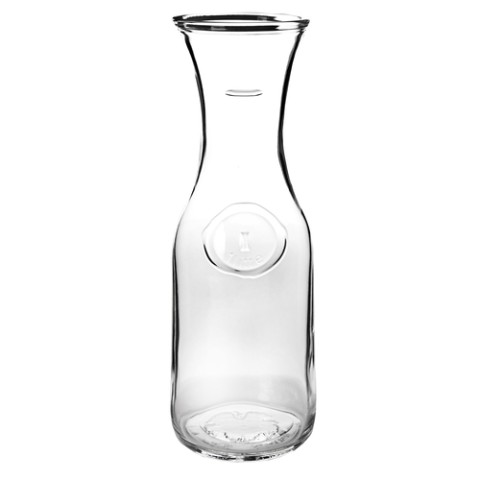 Litro Classic Carafe, 1 liter, 3-7/8" dia. x 10-7/8"H, fill line indicator mark on neck, medallion insignia, glass, clear (bulk pack)