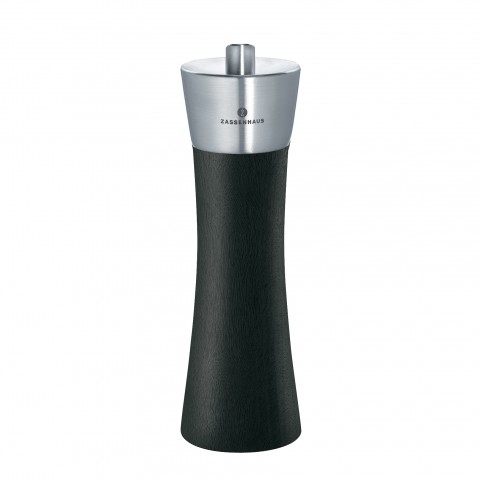 Augsburg Pepper Mill, manual, 2" dia. x 7"H, 6-position dial adjustable from coarse to fine, German ceramic grinder, corrosion free, hand-wash only, beechwood & stainless steel, black stained, Zassenhaus, Made in Germany