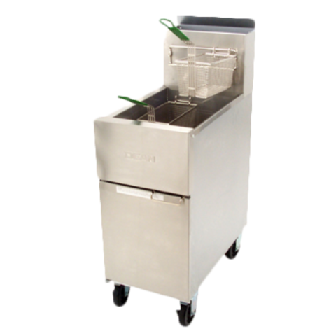 Dean® Super Runner Value Fryer, gas, floor model, 50 lbs. capacity, durable temperature probe, millivolt control system (requires no electrical hookup), includes: rack-type basket support, basket hanger & twin baskets, stainless steel frypot, front & door, aluminized sides, 6" adjustable steel legs, 120,000 BTU, CSA Star, CSA Flame, cCSAus, NSF