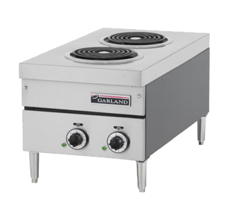 E24 Series Hotplate, electric, 15" W, countertop, (2) 8-1/2" flat spiral tubular elements with individual infinite controls with indicator light, stainless steel front and sides, 4" legs, 4.2 kW (Garland)