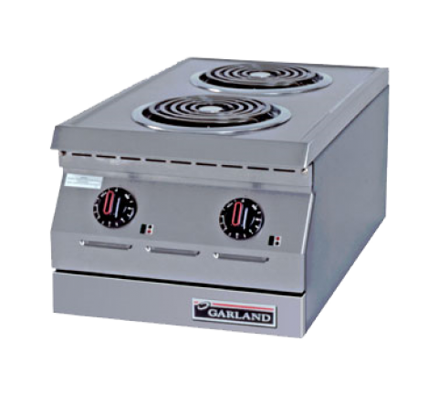 Designer Series Hotplate, electric, 15" W, countertop, two burners, 8" flat spiral tubular elements with individual controls, stainless steel front, sides, recessed top and 4" legs, 4.2kW, CSA, NSF (Garland)