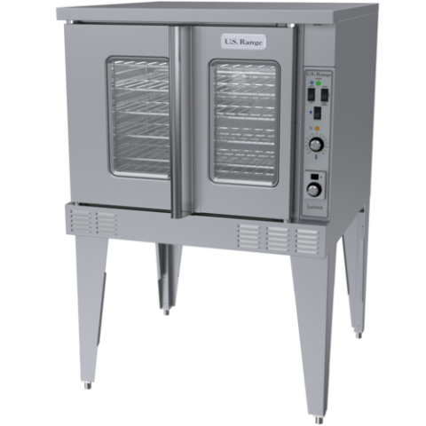 Signature Summit Series Convection Oven, gas, single-deck, solid state controls with 150° - 500° F, electromechanical thermostat and 60 minute timer, (5) chrome plated (13) position oven racks per deck, electronic spark ignition, dependant 60/40 doors with double paned thermal windows, stainless steel front, sides, top, 25-1/2" legs, porcelain cavity, 53,000 BTU, UL, cUL, NSF (USRange)