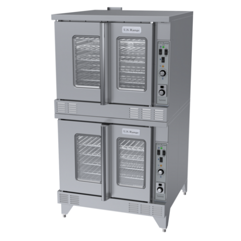 Signature Summit Series Convection Oven, gas, double-deck, solid state controls with 150° - 500° F, electromechanical thermostat and 60 minute timer, (5) chrome plated (13) position oven racks per deck, electronic spark ignition, dependant 60/40 doors with double paned thermal windows, stainless steel front, sides, top, 6-1/2" legs, porcelain cavity, 106,000 BTU, UL, cUL, NSF (USRange)