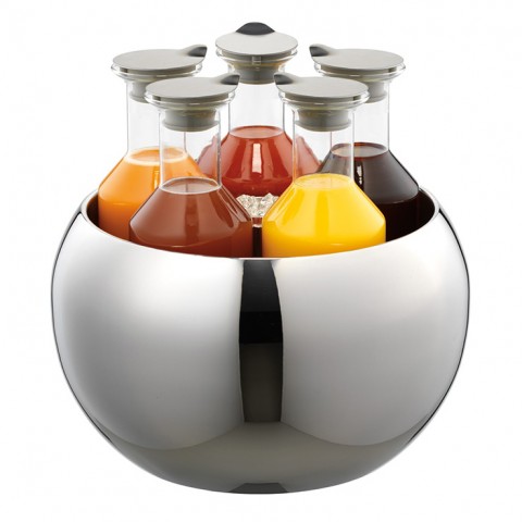 Frilich® Carafine Beverage Tub Set, 13-4/5" dia. x 12-3/5"H, includes: (5) 1.3 qt. (1.2 liter) Tritan plastic carafes with stainless steel lids, double wall stainless steel tub, removable stainless steel crushed ice tube, polished finish
