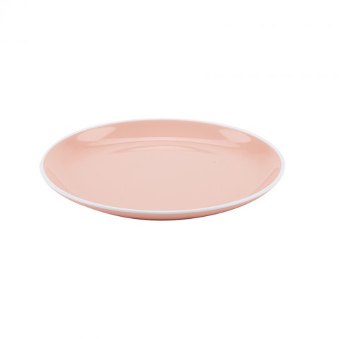 Settlement™ Oasis™ Dinner Plate, small, 9-1/2" dia., round, coupe, break-resistant, dishwasher safe, BPA Free, melamine, grapefruit pink with white trim, NSF (to be discontinued, contact factory for availability)