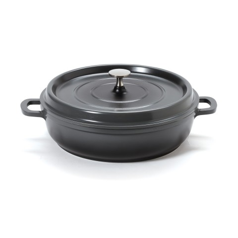 Heiss™ Braiser Pan, 3 qt. (3-1/2 qt. rim full), 10-1/4" dia. x 2-7/8"H, round, with lid, heat resistant to 500°F, oven/induction/gas/electric/open flame safe, dishwasher safe, chip and stain resistant, cast aluminum with induction base and ceramic enamel coating, gray with black interior, clear coat finish
