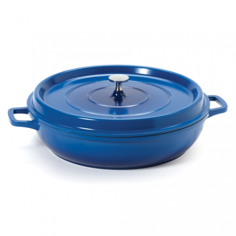 Heiss™ Braiser Pan, 4 qt. (5 qt. rim full), 12-5/8" dia. x 2-7/8"H, round, with lid, heat resistant to 500°F, oven/induction/gas/electric/open flame safe, dishwasher safe, chip and stain resistant, cast aluminum with induction base and ceramic enamel coating, cobalt blue with black interior, clear coat finish