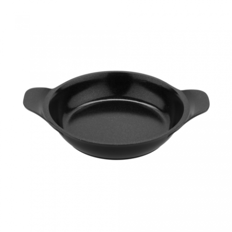 Heiss™ Mini Induction Pan, 10 oz. (10.75 oz. rim-full), 5.75" dia. x 1-1/4"H, round, with handles, heat resistant to 500°F, oven/induction/gas/electric/open flame safe, dishwasher safe, chip and stain resistant, cast aluminum with ceramic enamel coating, black with black interior, clear coat finish
