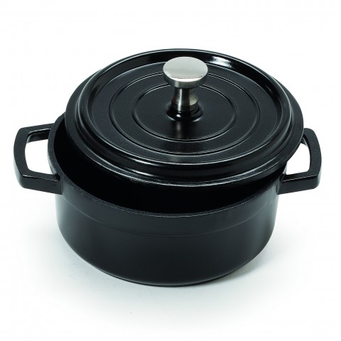 Heiss™ Mini Induction Bistro Pot, 8 oz. (10 oz. rim full), 4-1/4" dia. x 1-3/4"H, round, with lid, heat resistant to 500°F, oven/induction/gas/electric/open flame safe, dishwasher safe, chip and stain resistant, cast aluminum with ceramic enamel coating, black with black interior, clear coat finish