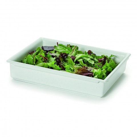 Bugambilia® Fit Perfect™ Food Pan, 1/2 size, 3-3/4 qt., 12-5/16"L x 10-1/10"W, 2-1/2“ deep, stackable, dishwasher safe, cast aluminum with resin coating, smooth MOD finish, white (edge to edge dimensions match standard stainless steel food pans) (PATENT PENDING)