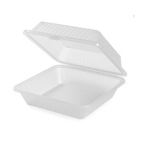 G.E.T Food Container, 9"L x 9"W x 3-1/2"H, single entree, 1-compartment, leak-resistant snap closure, stackable, reusable, recyclable, break-resistant, dishwasher safe, microwave safe for re-heating, BPA free, polypropylene, clear, Eco-Takeout's®, NSF