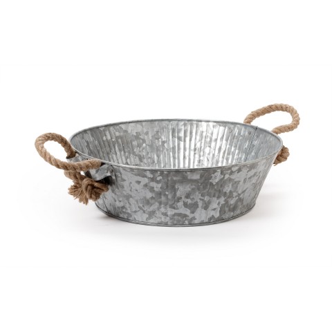 Tray, 14" dia. x 4-1/5"H, round, with rope handles, hand-wash recommended, galvanized metal, gray (to be discontinued, contact factory for availability)