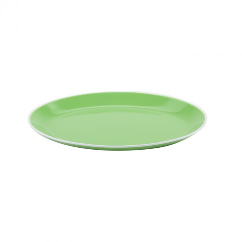 Settlement™ Oasis™ Dinner Plate, small, 10"L x 7-3/4"W, oval, coupe, break-resistant, dishwasher safe, BPA Free, melamine, apple green with white trim, NSF (to be discontinued, contact factory for availability)