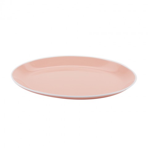Settlement™ Oasis™ Dinner Plate, small, 10"L x 7-3/4"W, oval, coupe, break-resistant, dishwasher safe, BPA Free, melamine, grapefruit pink with white trim, NSF (to be discontinued, contact factory for availability)